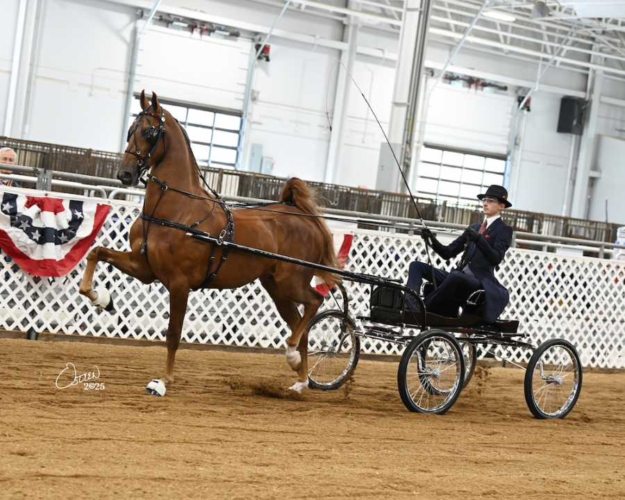 CONSIGNOR'S STATEMENT: Here is terrific young horse that is just beginning to show his potential. Walterway's Oh Me! won his WC title in the ASHBA Amateur Futurity Yearling division last year, and was RWC in the National Futurity. He had some time off to grow up and has since taken to his training like a good one does. He showed successfully in harness at Indianapolis and we will ride him through the sale in a full bridle, showing his trainability and versatility. This colt is super expressive and fun to work, showing great personality in everything he does. By the up-and-coming young sire Dark Pegasus, his dam is a full sister to multi WCC CHWalterway's Remember Me. His new owner will make a smart buy here.