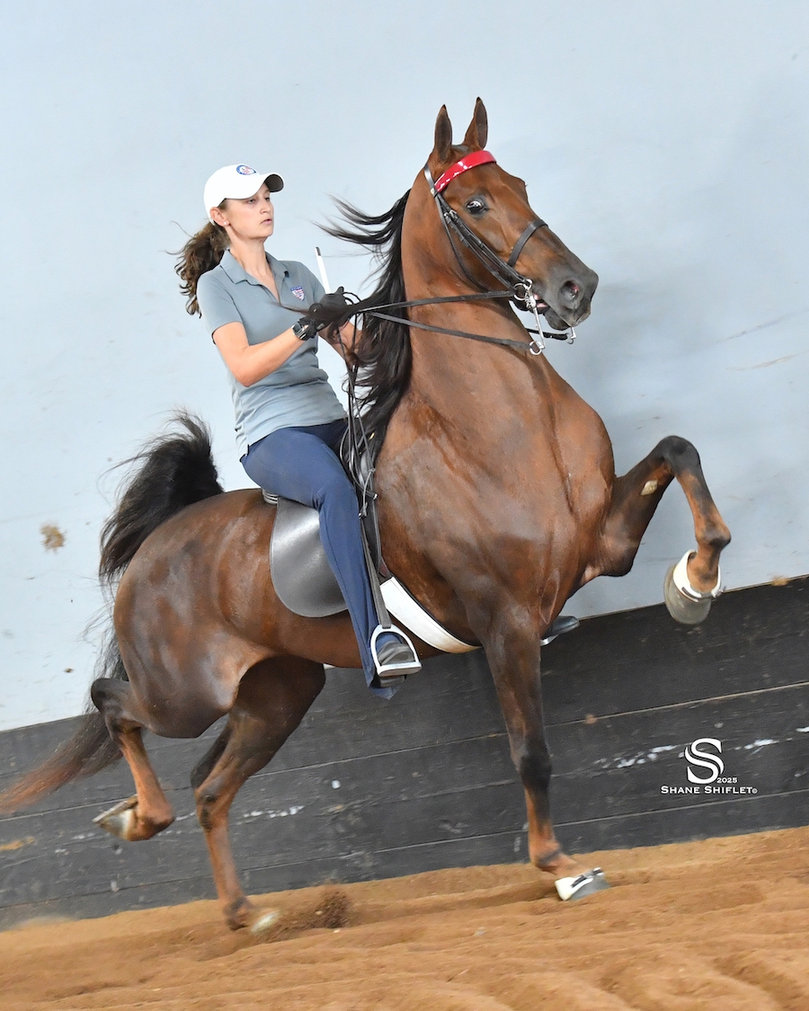 CONSIGNOR'S STATEMENT: Walterway's Memorable Kiss is a top five-gaited prospect. Due to a late start, this mare is just now getting ready to make her show ring debut. She possesses all the traits to be an outstanding mare in 2026. She never backs an ear and can rack and trot with ease. She is by the WGC sire Callaway's Northern Kiss and out of a WGC sire WC Desert's Supreme Memories daughter. Her second dam, Columbia's Cherry Blossom (BHF), is the dam of WGC Memories Citation. Her pedigree speaks for itself. Memorable Kiss wears a show bridle, jogs, and hauls. This outstanding mare is ready to grace the winner's circle in 2026.