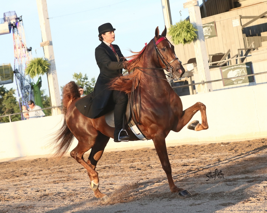 CONSIGNOR'S STATEMENT: Bailey's Nutterlicious is an elegant three-year-old mare that has already proven herself in the show ring. With a win in a large Three-Year-Old Park Pleasure class at Rock Creek and a tie in the top ribbons at both the Mercer County Fair and the World's Championship Horse Show, she will be ready for an amateur or juvenile next year as only a four-year-old. She is by the beautiful up-and-coming WC sire RWC Glamorous Nuts, sire of WC Mr. Glamorous, WC Grey Ride Memorialize, WC A Glamorous Dream and WC He's Invincible, just to name a few. She is out of the show mare Celtic Design, and her second dam, RWC A Touch Of Heir, is a half sister to WC CHA Touch Of Champagne. Bailey's Nutterlicious is talented, flat walks easily and thinks the best.