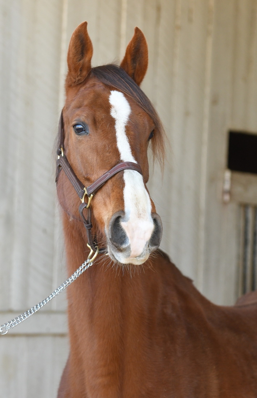 MARKINGS: Elongated star, connected stripe widening to snip touching both nostrils to upper lip, right hind sock, white