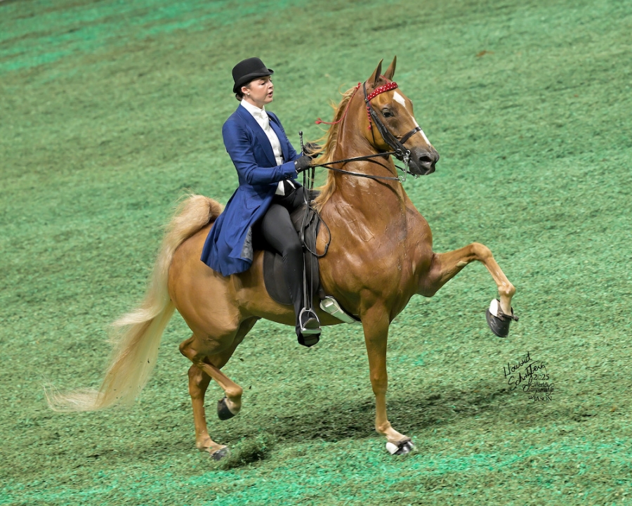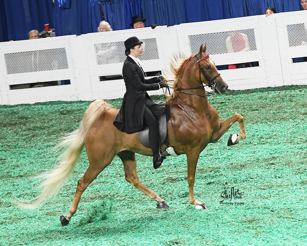 CONSIGNOR'S STATEMENT: From Louisville to Kansas City, from Shenandoah to Indianapolis, from Harrodsburg to Ocala, Lexington, Bonnie Blue and Raleigh, Walterway's Meant To Be has proven time and again that he is one of the very best five-gaited horses showing today. Currently a Ladies Five-Gaited Gelding World's Champion, he has also won at Kansas City the last two years and continues to improve with maturity. Meant To Be loves his job and particularly loves a horse show, bringing his big personality, perfect gears, flashy coloring and show horse ways to the ring every time he competes. Bred to be the star he is, he is a half brother to WC CHWalterway's Born To Be Wild. and to RWC Walterway's Born On Top. He jogs well, is wonderful to be around in the barn and is easy to maintain at a high performance level. He is entered at Kansas City this year and ready to carry an amateur or junior rider to the top of the five-gaited division.
